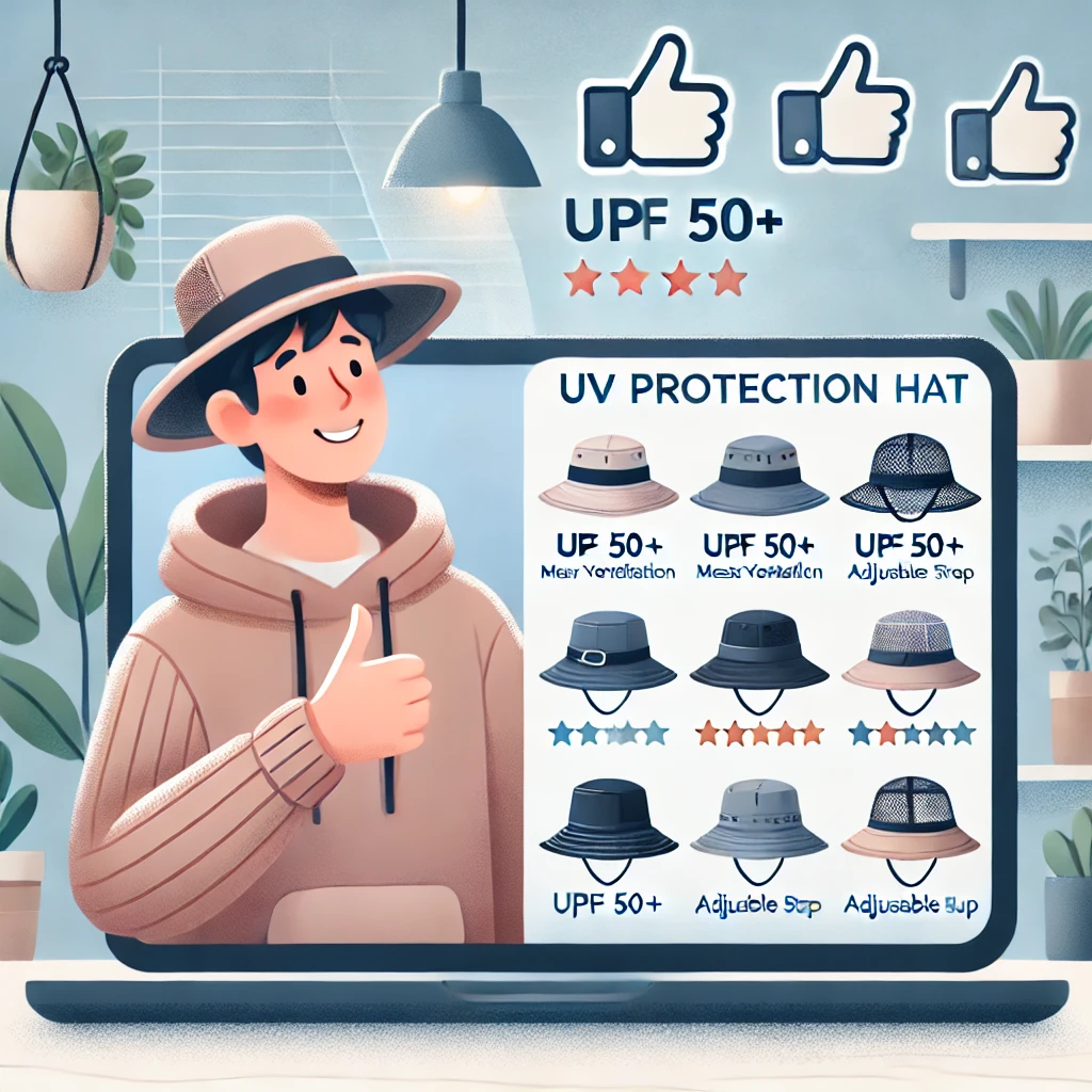 모자를 구입할 때 **“UPF 50+” 또는 “UV Protection”**이라는 문구가 있는지 확인하세요.
