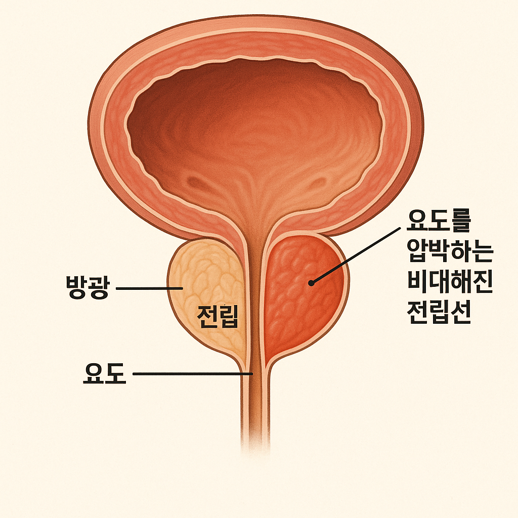 전립선비대증은 전립선 조직이 비정상적으로 커지면서 요도를 압박하고, 배뇨 장애를 일으키는 질환입니다. 주로 50세 이상 남성에게 발생하며, 방치할 경우 삶의 질 저하 및 심각한 합병증으로 이어질 수 있습니다. 이미 이 병을 아는 분들이 많을 것 같아서 그림은 생략하겠습니다.